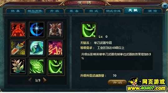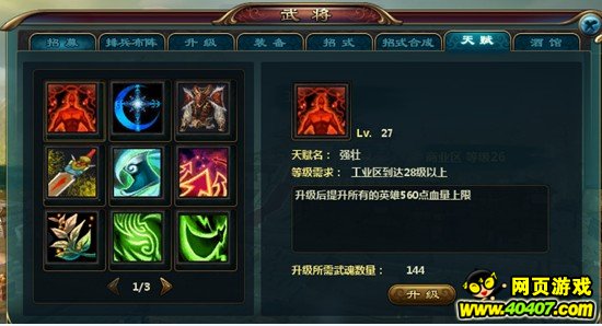 1、升级天赋科技。天赋非常重要,高等级的天赋科技增加的属性几乎等同于高品质装备所附加的属性值。强征、武器、甲胄、精准、灵巧、弱点攻击、冲锋等天赋,能升到多少级就尽量升到多少级,这能直接大幅度增加武将的属性,提升武将作战能力。如果有玩家说都是同样的等级、同样的装备,为什么别人的血量、攻击、防御都比自己的高,很大可能性就是你的天赋科技等级不如别人。