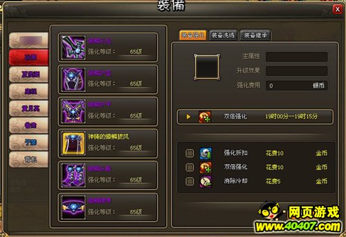 虽然强化不存在成功率问题让人省了不少心,但是《龙将》中的装备强化也并不便宜,特别是到了高等级的时候,往往玩家一天通过打怪、任务和摇钱得来的银子都用于强化装备了,而且在游戏中,强化的效果显而易见,一套未强化过的紫色装备比一套高强化的蓝色装备在各方面属性上都要差很多。