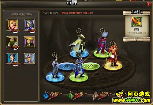 前军是是作为肉盾的存在,一个拥有最强防御的盾是一个团队的核心,因此首先升级前军的防御类的装备很重要,其次是腰带,由于前军的伤害较低所以不急于升级他的武器,50级如果有玩家招孙策的话可以着重升级他的长靴,因为他的技能释放后可以提高闪避率。