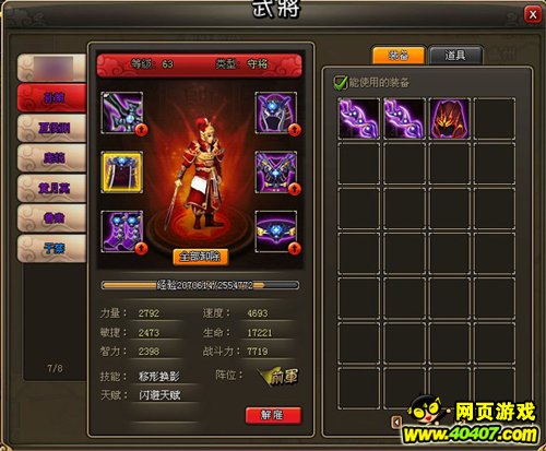 《龙将》中的装备一共有武器、铠甲、头盔、披风、靴子、腰带六种,武器是增加攻击的,铠甲和头盔是增加物理防御的,披风是增加策略防御的,靴子是增加速度的,腰带是增加生命的。了解完各个装备不同的用途,我们就可以根据前军、中军、后军不同的特点来有针对性地强化装备了。