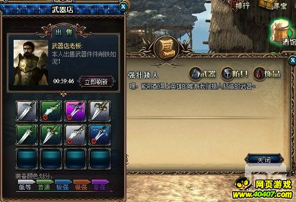 所有的装备都可在装备店进行购买,装备店每1小时刷新一次,可随机刷新出白色-紫色的装备(经本人测试,可刷出紫色装备)装备的等级跟随人物等级在10级之间浮动,也就是20级的人物最多可购买到30级装备。