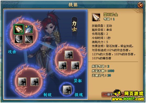 点击“V”键可以打开技能窗口, 在这里玩家可以查询自己技能信息。只要达到对应的条件即可学习或升级相应的技能。鼠标左键单击技能图标按住不放,就可以拖动该技能到快捷栏里方便玩家使用。