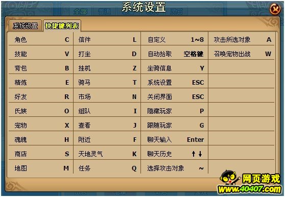 为了更方便游戏操作,建议您使用游戏设定好的快捷键,可以轻松打开游戏各系统界面、快速放出技能等哦~~