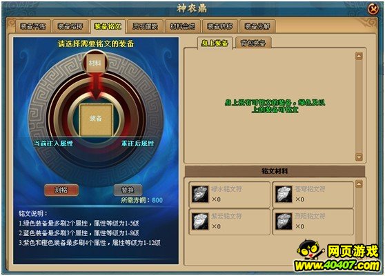 通过装备铭文可以给装备追加更加大的附加属性,装备颜色等级越高,可增加的属性多。