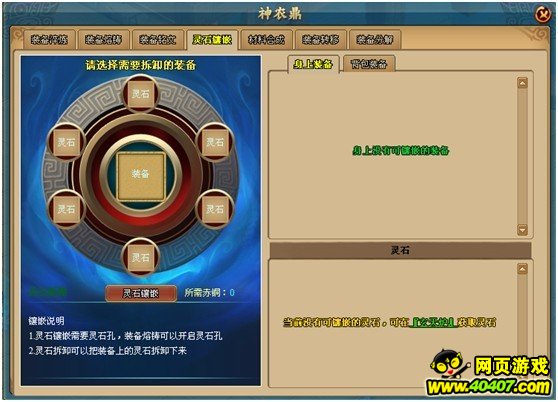 通过灵石镶嵌,可以增加装备属性,每件装备可镶嵌6颗灵石。