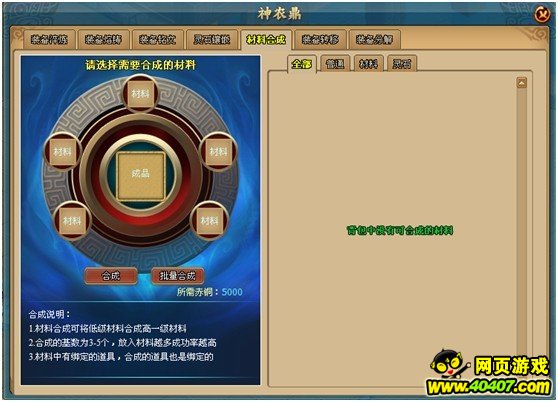 材料合成可将低级材料合成高一级材料,合成的基数为3-5个,放入材料基数越多成功率越高。