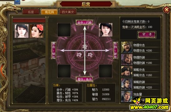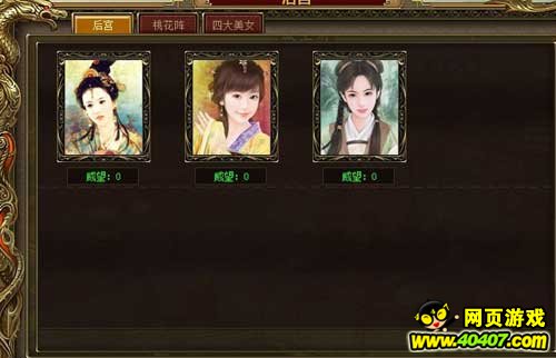 将后宫所拥有的美女放入相应的阵位中,获得相应的内政属性增加,阵位随着主角等级提升逐步开放,所拥有的美女数量由主角等级及威望决定。后宫美女都有相应的被动技能,可以通过玩家消耗金币通过“宠幸”指令获得成长。