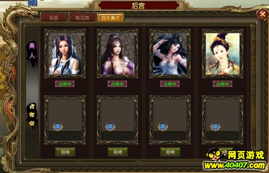 点击后宫中的四大美女界面,会显示现有四大美女的占有者,玩家可以通过PVP方式抢夺。