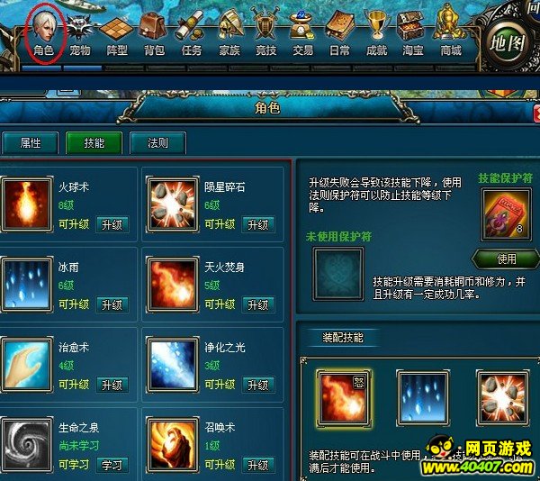 但需要注意的是:第一个技能格装配的技能为怒气技能。在怒气槽满时,将必然释放该技能。如果不想使用该技能,可以把技能从技能格里移除。