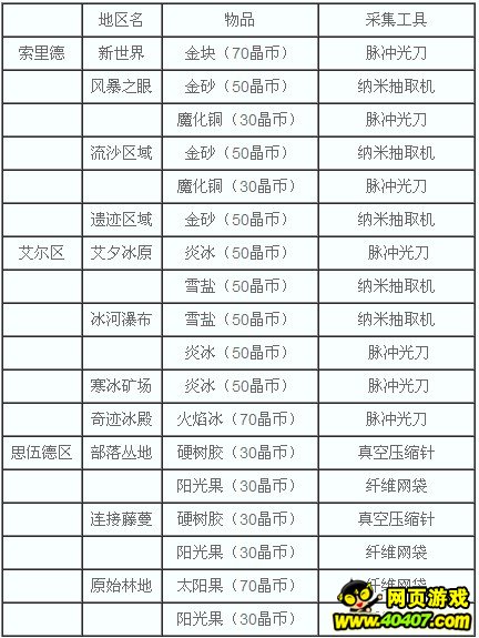 奥拉星各个地区采集物品有哪些