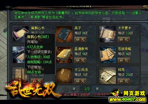 《乱世无双》兵法系统囊括了《扁鹊新书》、《三十六计》等十五部传奇兵法。每一部兵法都能够为我们带来不同的属性加成。对于游戏初期的玩家,鄙人推荐各位可以优先研究提升气血、技力的兵法,同时,为了能够更好的安身立命,各位还需要着重提升闪避值。所以在此时,《青囊书》、《鬼谷子》等兵法,就成为玩家首选。