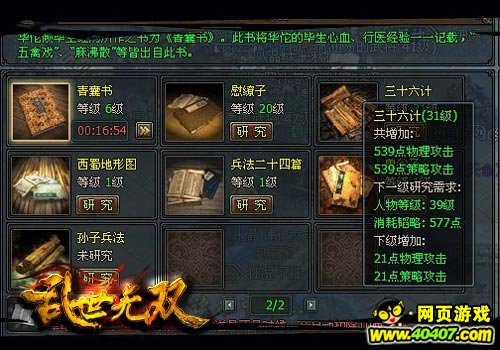 当玩家将等级提升至30级时,有关于生命值、技力的兵法不出意外应当不会差到哪去,所以此时玩家可以暂时放开这些兵法,转而研究提升攻击力和防御力的兵法。此处鄙人推荐《慰缭子》和《三十六计》,因为这两本兵法能够同时提升玩家的物理攻防和策略攻防两大属性,可以达到事半功倍的效果。