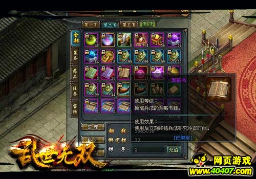 不过,经过改版后的《乱世无双》研究兵法将消耗韬略,虽然不多,但玩家可以选择做几个环任务之后,在进行研究。同时,每天中午12点到1点一个小时的双倍读书时间千万不要错过。此外,小编还推荐各位去泰山刷“军略书”,每次至少能有一本,所以几遍泰山下来,各位就能够轻松升级兵法。