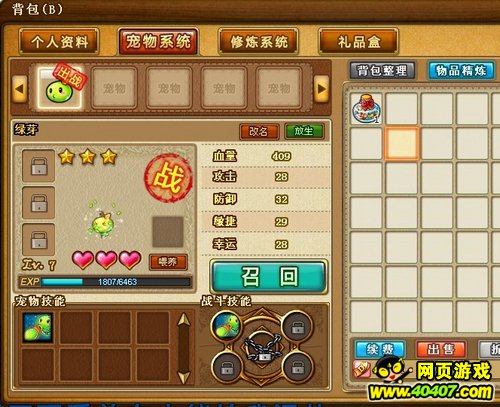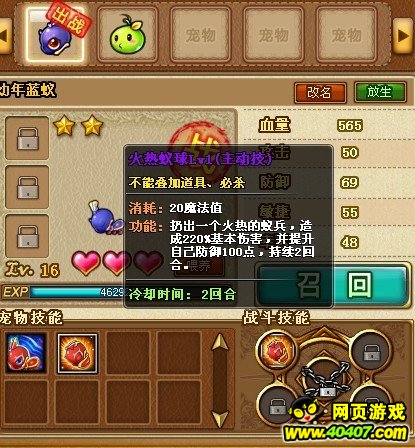 另外 每一个宠物有不同的技能,像蚂蚁 在给别人伤害的同时 还能增加100防御:啵咕 给别人伤害的同时增加幸运值:小绿芽 在给别人伤害的同事 每回合回复300生命 持续2回合:小鸡的技能是跟踪弹 不过目前我还没见过=-=|||