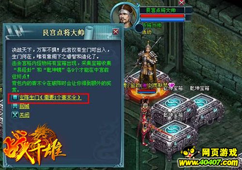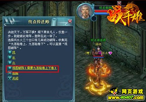 由于九宫地图会随机变化,玩家不能事先知道闯宫顺序。不过玩家如果能击败随机出现的“点将大帅”,就能获得“九宫秘卷”。秘卷分为上下两卷,玩家若能收齐两卷,就可以直接查看九宫地图,破阵而出,如果只收集到一卷,就得在“风、水、火”选择一种,选对了一样可以顺利出阵。