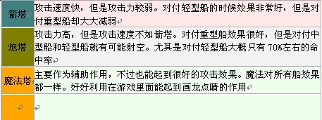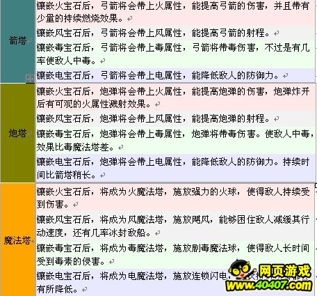 2. 造塔攻略: 游戏里面有3种塔,每种塔能镶嵌4种不同的宝石,其中箭塔和炮塔还能改造5次来得到不同的效果。在防守时,箭塔,炮塔,魔法塔各有所长缺一不可。射程箭塔最小,而风魔法塔最大。在建塔布位的时候做到轻重协防能达到事半功倍的效果。