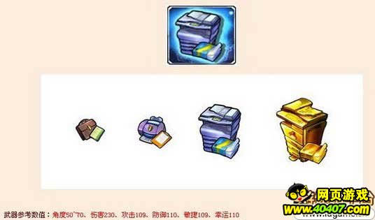 极·工作狂。不疯魔不成活,夜以继日的高效运转,承受强大工作量的打印机在封魔后成为了IS弹弹堂极武器。极?工作狂的角度范围非常适合高抛,高属性的攻击有着强大的输出以及杀伤力,高抛能够造成毁灭性的深坑效果,工作狂的怨念让对手不寒而栗。随着强化等级提升,工作狂在体积变大后将恢复真身,黄金打印机将工作狂的怨念完全释放,必杀技威力四射,让敌人无处遁逃。这就是IS弹弹堂武器库全新极武器——极·工作狂。