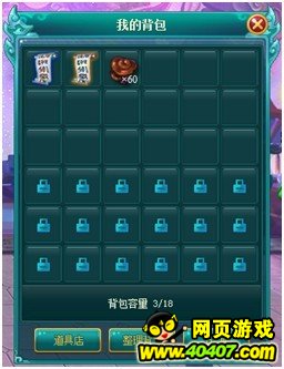 点击屏幕下方的快捷图标栏的【背包】,即可打开【背包】界面。背包界面可以通过快捷按钮【道具店】进入商店,购买道具;也可以点击【仓库】按钮,进入到仓库中。同时也可以点击【整理背包】,对背包里的物品进行统整理。