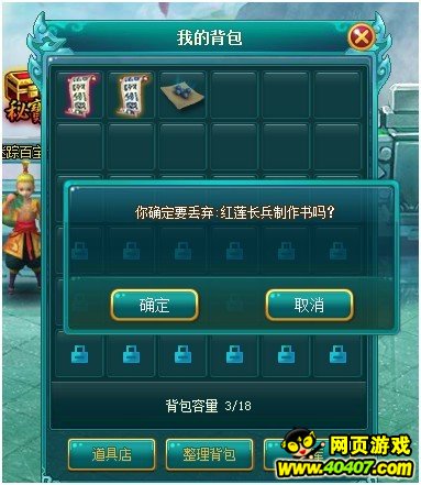 选定【背包】中的某个物品,按住左键可以抓起该物品,将其拖到背包物品栏外,松开左键系统会提示“你确定要丢弃物品?”选择“确定”即可,丢弃后物品将消失。也可以左键单击物品,选择丢弃即可。