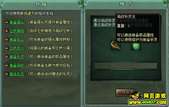 在通过熔炉系统,把装备和祈灵玉放进去,然后点击“开始祈灵”来激活装备的极品属性,这就是所谓祈灵。非常简单的操作,但是带来的属性却是让大家都流口水。