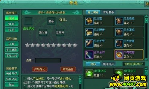 装备强化需要放入相应需要强化的装备及强化石进行强化,强化共有二十级, 一级至三级的成功率是100%,之后随着强化等级的提高而下降,可以使用幸运符提升成功率,强化的道具如果不想使用了还可以将强化转移到别的道具上,但只有同一类型的装备才能进行转移,转移装备强化值需要大于0,目标装备的强化值必须小于原有装备,转移后原有装备不会消失,但强化值会变为0,这样就大大降低了玩家对武器强化的消费哦!