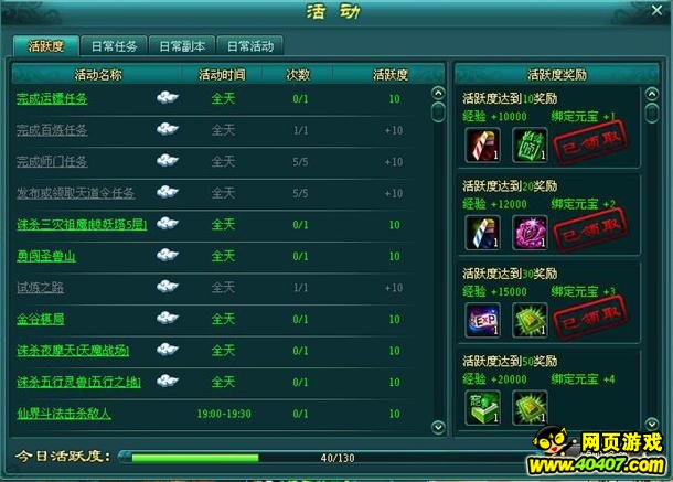 最后一项,最常见也是最容易忽视的,就是每日活跃度了,点击小地图边上的“活”字就能查看,这里的条件只要打打副本和满足挂机时间就能完成。有的玩家可能因为太忙没时间打副本,但其实这些副本不用打,只要你进去了,就能获得活跃度,这点很多玩家都不注意的。每天都挂挂机,打不了副本就进去一下就出来,累积下来的奖励也很可观。
