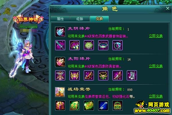 首先要说的是装备兑换,有的玩家经常看到别人一身紫一身橙,可自己啥也没,去打副本嘛总是人品不好,也刷不到好装备。其实也许很多玩家已经知道了,紫色装备其实可以使用太阳和太阴碎片来兑换的,在角色界面可以找到兑换选项,在这里面就可以用太阳和太阴碎片来兑换装备,好吧,新的问题又来了,碎片不够怎么办?