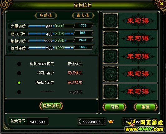 通过花费一定真气或金子、金券,即可有一定几率提升宠物的各项资质