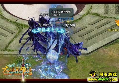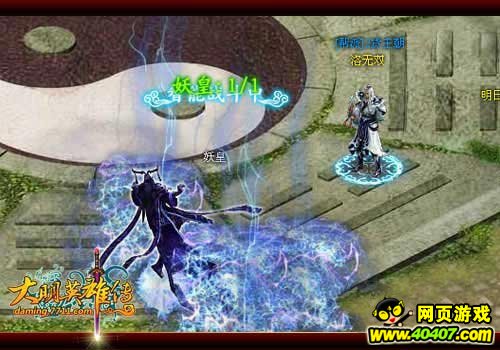 经过一番鏖战来到山顶,只见一个身披道袍的怪物立于八卦阵中,他应该就是传说中的妖皇了。妖皇最常用的招式有二,一个是分身,分出3个假妖皇来承担玩家的攻击,还一个是召唤小妖,妖皇一声令下,小妖就会从四面八方涌向玩家。所以,在挑战妖皇时一定要集中注意哦!