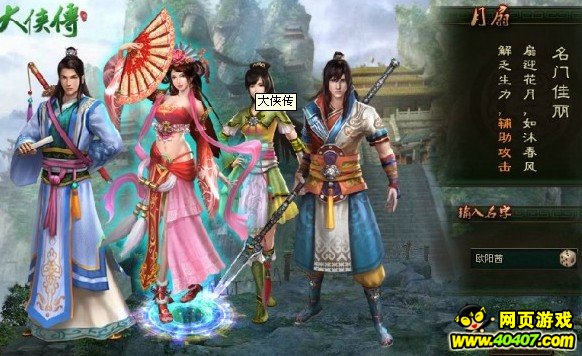 每个大侠角色有相对应的武器,切记谨慎选择!大侠角色由左至右的对应名字依次为灵剑、月扇、羽刀、烈枪。