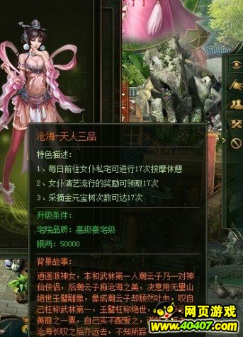 一座豪华的宅院,会让你在游戏获得更多的收获,美丽的女仆、海量的银两,超多的经验,帅气的侠名,容量巨大的仓库。