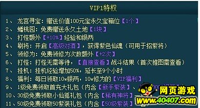 1、会员是必须的,不必充多,至少也充个VIP1;才10块钱,但多了很多普通玩家没有特色功能。比如龙宫多了一个永久宝箱位、桃园多了一块地、打怪增加10%经验和银两等等。但最重要的是可以招紫将和获得30级小狐仙、50级紫套装以及新手紫套装+500W银两。这些就是前期冲刺的必须品,新手紫套装完全够你用到换60级的紫装,小狐仙完全可以顶得上200紫魂的将,这最少给你节省了1000W银两。