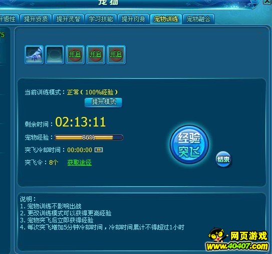 2:在练级的同时不要忘记给宠物也训练等级,只需缴纳少量的金钱就可以让宠物进行训练,让宠物不会落后自己角色等级,配合自己东征西讨。
