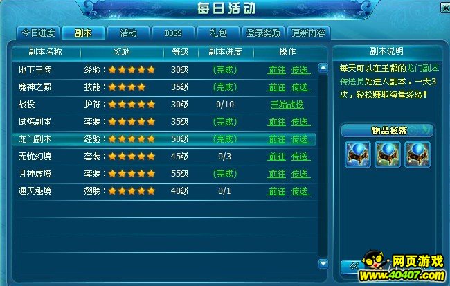 龙门副本,每天可以进行3次副本,可以通过击杀副本中的怪物获得海量经验,而且还可以有机会获得经验丹。
