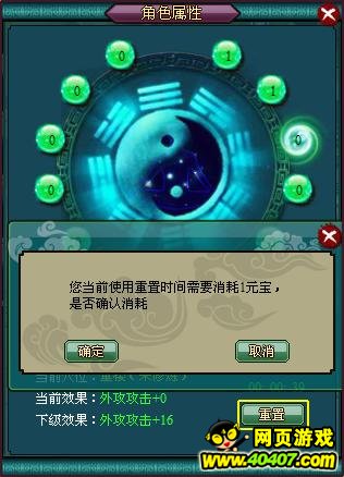 3. 重置:每次修炼经脉都需要等待一定时间,如果想跳过等待时间直接晋级下一穴位的修炼,点击“重置”按钮,消耗一定元宝和银两即可重置时间。