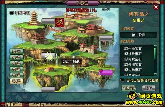 等级到达25级,可通过主界面右上角闯关面板参与勇闯侠客岛,每天可刷新一次进度。侠客岛是考验玩家实力的试炼场,也是紫色装备获取的最佳场所。