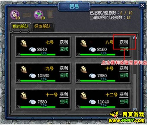 贸易往来:如果呈启动状态,且自己拥有空闲的贸易船队,即可与他进行贸易往来,贸易可以在线下自动运行。当贸易完毕,点击获利即可收取贸易利润(注:贸易对象当前图的星级越高,贸易利润就越大,同一关卡好友间的贸易能够获取最短贸易时间,如果贸易对象与自己关卡不同,会大大延长每次交易的时间,从而导致每次贸易效率降低)。