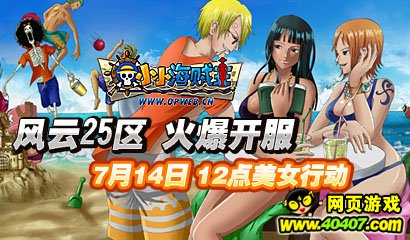 《小小海贼王》不删档测试开启后,玩家热情高涨,新服火爆连开。风云25区将于7月14日12点火热上线! 《小小海贼王》是一款以日本动漫故事为背景的大型同人网页游戏,小小海贼王以海贼王剧集为蓝本,在游戏中打造出多种海贼王职业,玩家可通过海贼王招募,发布悬赏,任务,战役等一系列创新玩法进行激烈对碰,想成为草帽海贼团吗?带上你的伙伴,冲进大海深处,寻找海贼王的宝藏吧!