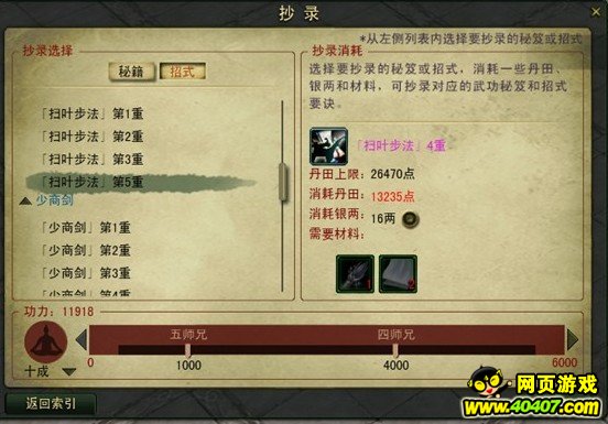在剑啸江湖到达一定得等级,可以和其他玩家交易所学的武学技能秘籍,需要先准备好材料才可以抄录,是游戏的一个比较特色的玩法,如果有幸得到绝学,你还可以抄录出来买个好价钱,一举两得,抄录的条件需要准备好才可以哦,会扣除一定的丹田银两,还需要材料,如图