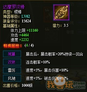 神器选择方面,神器推荐选择第一是罗汉棒(攻血速),其次是陨铁巨棒(攻血速),最差的当然是无影神针(虽然是鸡肋,但是毕竟是紫色,有对应的优势,具体缘由之后讲黄药师的时候会说明)神器效果洗练方面,着重无双(10%伤害),双煞(10%概率连击);此时可以有不同的打造路线(第一篇介绍素素的打造方法中有提到过的),即破击和暴击两种路线(当然成昆是可以两向同时发展的,但是个人感觉还是精专一项比较好),暴击方面可以选择残暴,雷厉,龙胆;破击系列选择破天,风驰,虎狩。鉴于成昆本身控制对手的能力,也可以选择雷厉加风驰来追求高速控制(虽然不稳定)