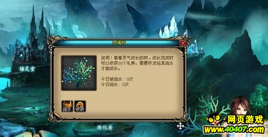 灵魂树,靠灵力值生长的地狱之树。玩家间可以相互浇水,浇水可以获得经验或礼券,每天最多只能浇10次。而且只能通过“互助”对好友的灵魂世界进行帮助,执行后会产生各种事件。