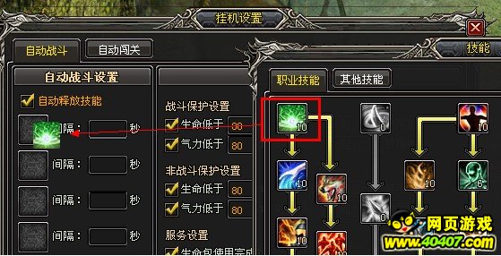 自动战斗的设置里可以拖入需要挂机的技能,保存设置后自动战斗则设置为优先使用设置技能,技能CD 的 时候则普通攻击的战斗模式。