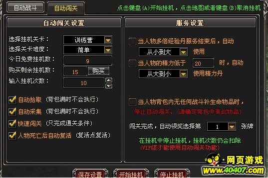 自动选项:自动拾取,自动采集,快速闯关,人物死亡后自动复活。(设置完成后记得点击保存设置)