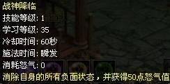 一般的对手会把“战神降临”用在前期为“霸斩”蓄积怒气。因为就算是1级的“战神降临”也能提供50点的“怒气”这技能CD时间长,是PK中最珍贵的技能,所以必须让“战神降临”施展出最佳的魅力