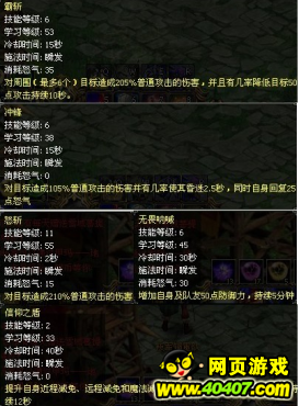 In the end, 我给童鞋们介绍下技能的加点方式,战士是靠“怒斩”“冲锋”这2个技能杀人的,喜欢PK的玩家应该优先选择加这2技能。毕竟“灵力”有限,“血脉复苏”“潜能激发”是被动技能。但也不能忽略。在点玩“怒斩”“冲锋”之后,这2技能是必点的,所以希望大家多多组队去密修,灵力高了,技能等级上去了,PK自然不会吃亏。