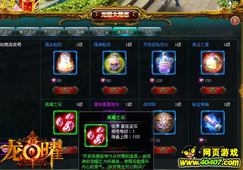 在《龙曜》的世界中,同一个道具有很多种获取方式。以英雄之石为例,玩家可以通过活动商店兑换(75徽章/1)、金币购买(50000金币/1)、商城购买(5魔晶/1)三种方式获得(打怪捡取的方式暂不入内),玩家要打通英雄座需要的英雄之石自然不需要通过魔晶去购买,把魔晶用在该买的地方才是正确出路。因此,玩家需要对活动商店以及金币商店里面的道具比较了解,才能把魔晶真正用在刀刃上。