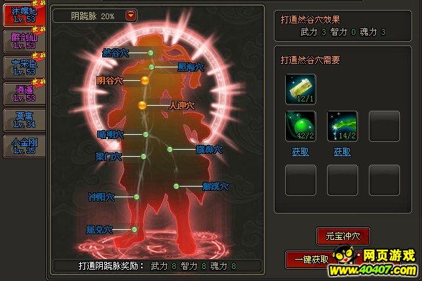 首先是按主线任务走1张张过图,中间有个细节需要注意,每张过图需要消耗体力,所以这里需要节约,每次过第7、14、21个关卡后,会有3个支线任务,支线任务从后面往前面做,因为后面的支线任务里的怪在你前面的支线任务中也有,可以大大节省你的体力。然后在这过程中打到的材料千万不要扔掉,留存起来材料主要用于装备制作,经脉冲穴后期是缺乏的,如果仓库中实在堆不下就优先用掉,不要卖掉。