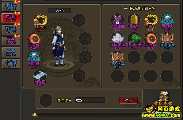 40级后重点就放在法宝装备和经脉了。前面预存的材料可以全部用来升级经脉,通过活动和每日任务可以得到大量游戏币,这个时候分为两步,第一步,每天体力用于挑战镇妖塔获得装备制作卷制作紫装备,游戏币用于天宫夺宝活动。