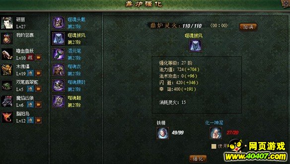 下图是装备强化界面,强化装备需要铁精和灵火值。先说铁精,这个大家都知道在游戏的副本里经常会掉落,尤其在大箱子的副本里,除了掉钱就是掉铁精了!