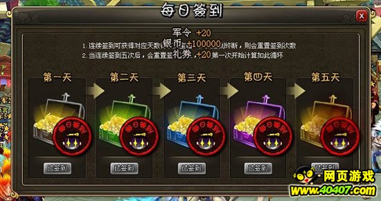 玩家每天第一次上线都能看见游戏界面上方的“签到”图标,签到后就可以领取签到宝箱,反正不拿白不拿,哈哈。宝箱里有20军令和一定数量的银币,连续签到5天的话,就有更丰厚的奖励哦!签到宝箱是每位玩家只要登陆游戏就可以领取的,不需要任何其他精力和财力的花费,并且每天只有一次。VIP玩家每天还有额外的礼券领取!